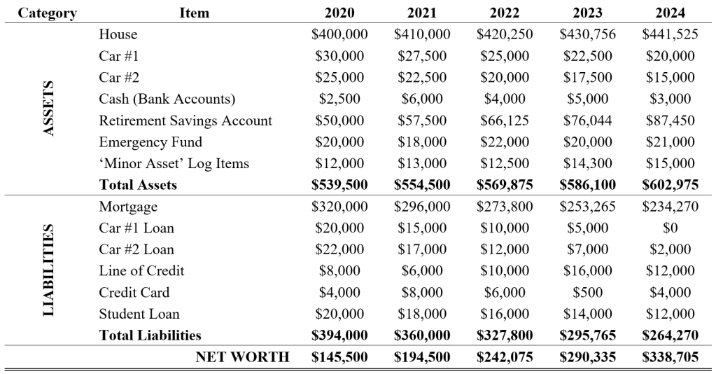 The Table below is an example of a Net Worth tracking sheet used for four years. As you can see, asset values increased over time while the sum of the liabilities decreased. Your objectives should align with this – increasing net worth while paying down debt. If you are single or unmarried, your net worth should be calculated individually. If you are married, you should include the assets and liabilities for yourself and your partner (i.e., your household net worth), since you should be working together with your partner to achieve your financial goals. In the Assets category, only list individual items with a value over $2,000; this will keep your table more concise. Items with values between $100 and $2,000, should be listed in the ’Minor Asset’ log items row and tracked on a separate ‘Minor Asset’ Log. All liabilities, no matter how small, should be listed.