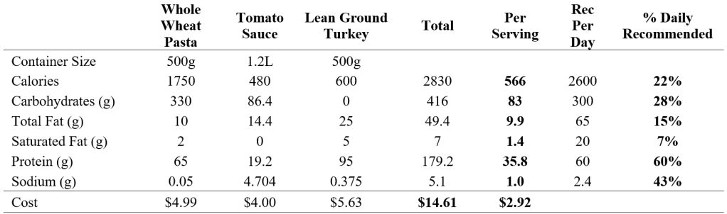 Some of my friends and colleagues go out for lunch daily. Sometimes, I join them. My typical lunch meal is $15. With tax and tips, the average meal is around $19. When considering the cost of transportation to and from the restaurant, at 5 km away (10 km round trip) and an average automobile operating cost of $0.40/km, the lunch outing cost me $23 – for a sandwich. If I did this daily, my yearly lunch cost would be nearly $6,000. Instead, meal planning can not only save you thousands of dollars, but it can also be much healthier. For several years, I have prepared the same meal that I eat for lunch almost every day when at work. Each Sunday, I prepare my week’s batch of pasta. There are 5 servings of pasta in a large Rubbermaid container that I bring with me to the office on Monday morning. Every day at lunchtime, I pull out the container from the office fridge and serve myself one portion of the pasta. Every week, at least one of my colleagues will comment on the large container of pasta – “wow, that’s a lot of pasta”, or “you’re still eating the pasta, huh!”. And I happily explain to them that not only is it healthy, but it is also cost-effective. In the Table below, I show the three key ingredients that go into my pasta – whole wheat pasta, tomato sauce, and lean ground turkey – and their commonly reported nutritional values. Although I am not a nutritionist, I believe that this daily lunch meal is healthier than eating out daily at restaurants. It is also much more cost-effective, at $2.92 per meal with the benefit of eating in the office and not needing to drive to get your meal. Now, I understand that eating the same thing every day is not for everyone, and not everyone enjoys pasta with ground turkey tomato sauce, but this is an example of how meal preparation can save you money and be healthier than eating out. As a cost evaluation, eating this meal every workday for lunch will save me around $5,000 per year compared with eating out!