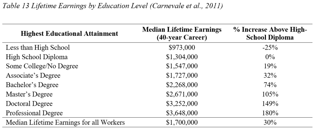 Carnevale, A. P., Rose, S. J., & Cheah, B. (2011). The College Payoff: Education, Occupations, Lifetime Earnings. In Georgetown University Center on Education and the Workforce. Georgetown University Center on Education and the Workforce. https://eric.ed.gov/?id=ED524299