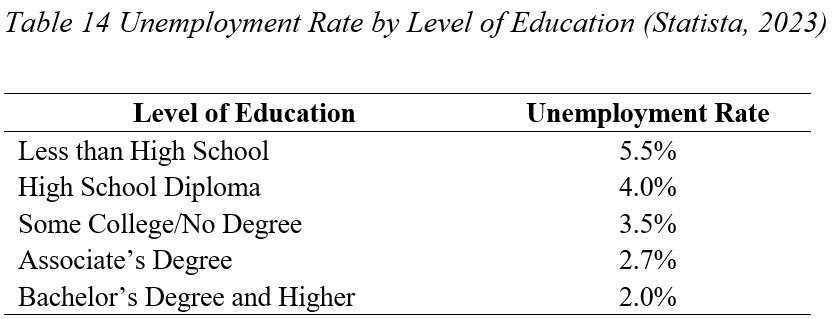 Post-secondary education is generally worthwhile and earning potential increases with educational attainment. Table 13 below shows data from Carnevale et al. (2011) and indicates that over a forty-year career, someone with a master’s degree will have earned more than twice as much as someone with only a high school education. And those with a professional degree will earn around $1 million more than a master’s degree holder will. Not only do degree holders earn more, but they’re also more employable. According to Statista (2023), the unemployment rate decreases with the level of attained education, too (see table 14 below).